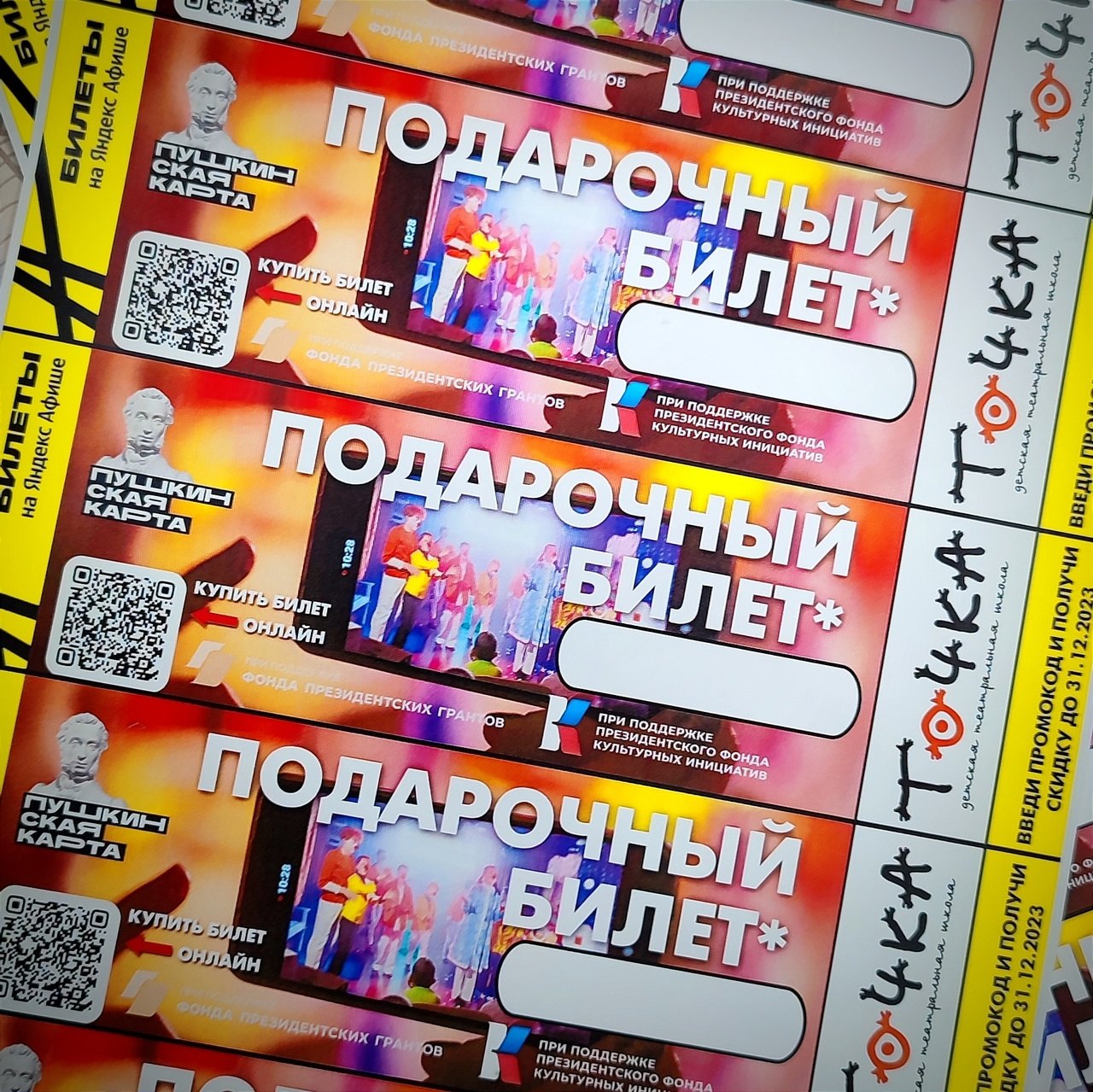Ребята из производственной мастерской разработали подарочные билеты — на них наносится промокод, дающий различные скидки на посещение спектаклей, выставок и мастер-классов нашего театра.