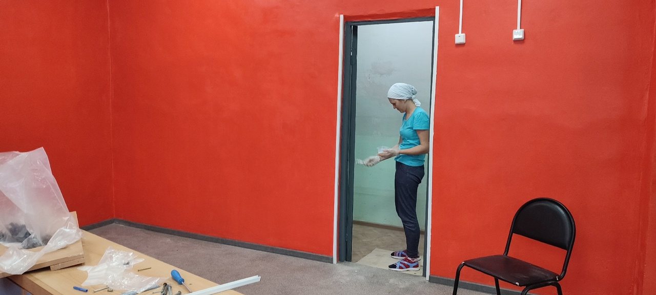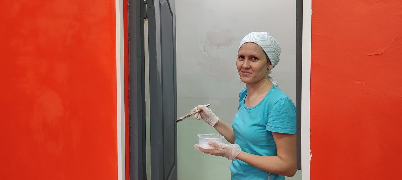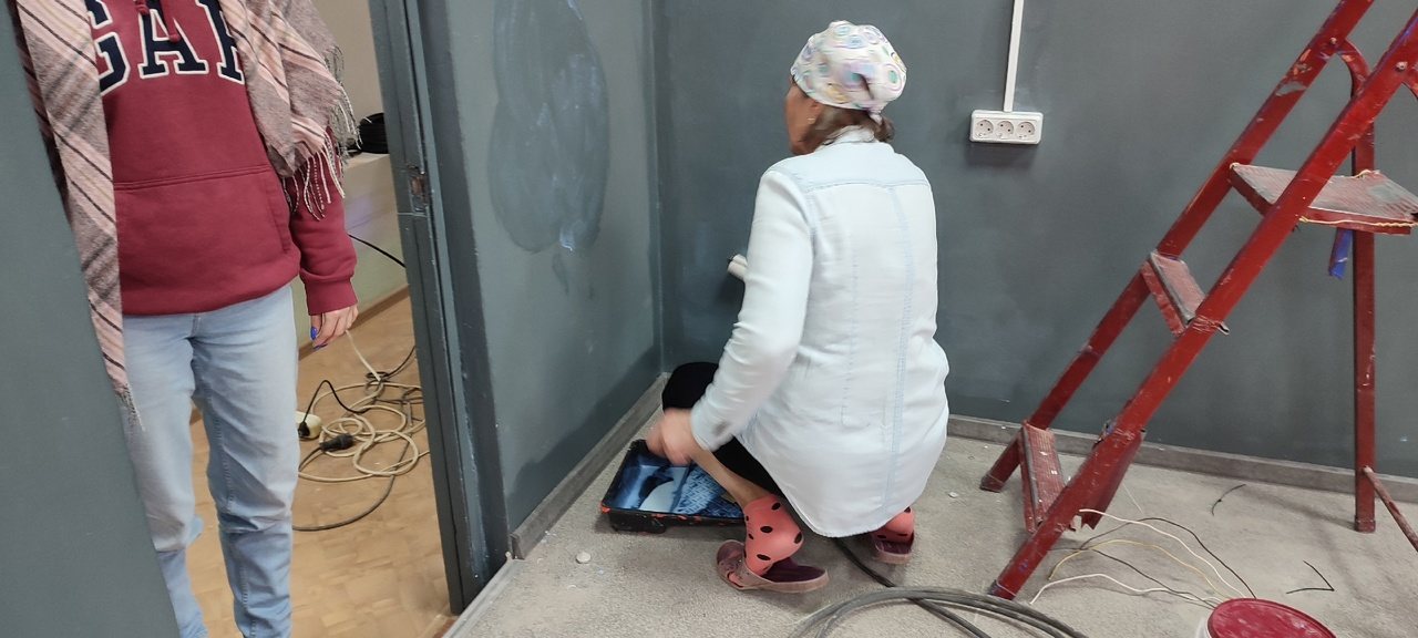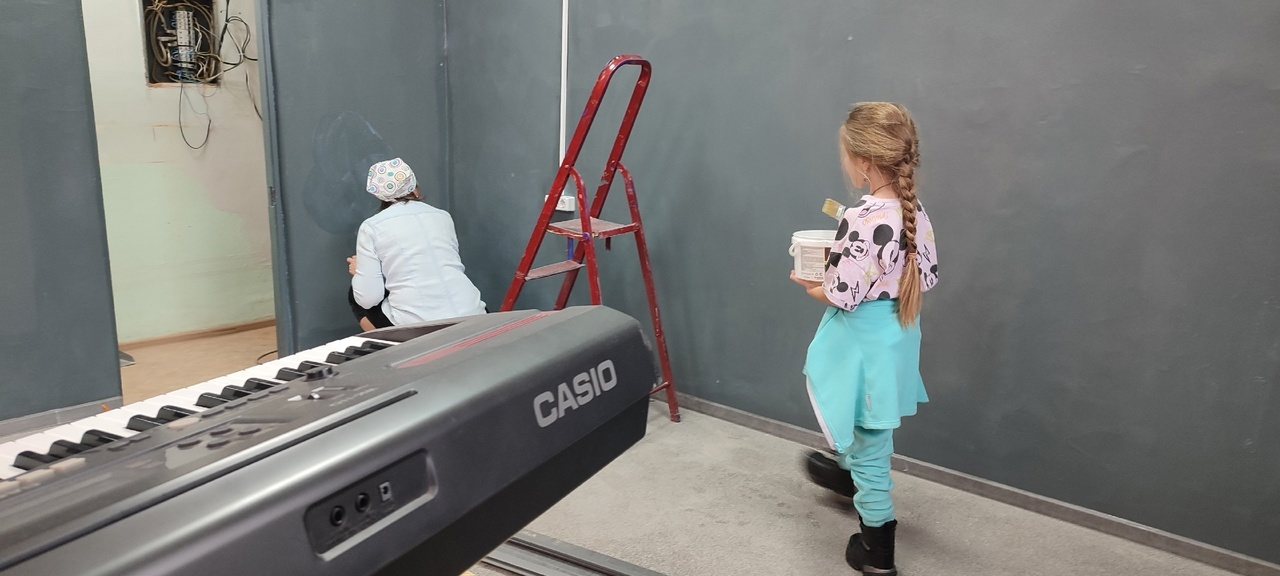 Наталья Дементьева и Ирина Ердуганова вместе с внучкой Ингой закончили работу над Театральной мастерской №3. Вчера там установил плинтуса Никита Санников . К занятиям класс готов.