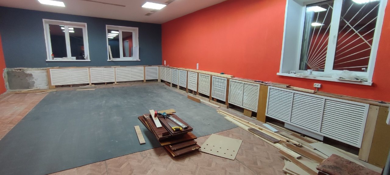 Владимир Сергеев конструирует в театральной мастерской №1 — закрыл регистры отопления декоративными панелями.